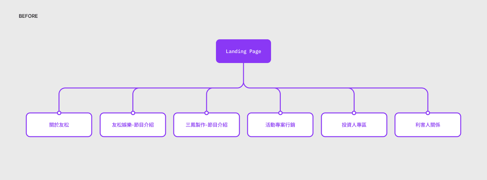 The new sitemap ensures the navigation bar is a concise summary of the brand identity. We shifted from an internal organizational perspective to a user-centric one, categorizing works by genre—Film, Drama, Documentary, and Variety Show. To showcase growth momentum, a "Development" section was added to highlight future projects to potential partners.
